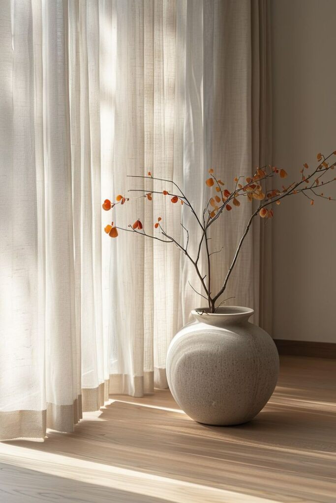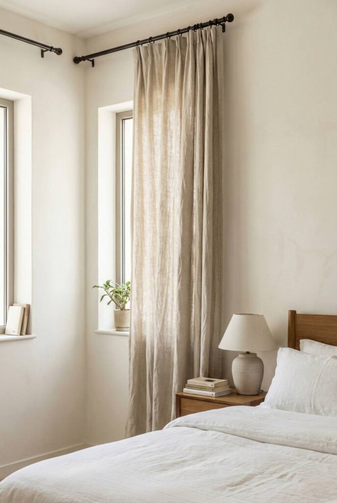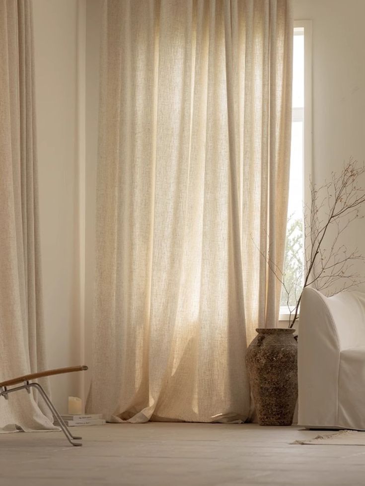 Curtains made from natural linen fabric to provide soft light, a relaxed look, and breathable comfort.